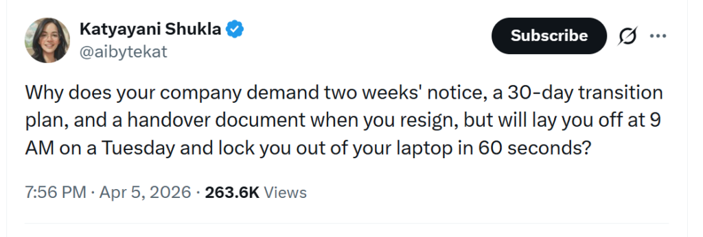 atyayani Shukla posted this on Twitter. Now she is in India, and I don’t know anything about Indian employment law, and generally write from a US (and sometimes European) perspective, but this is a question that comes up often. Why are employees expected to give two weeks’ (or more) notice,